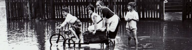 How did we survive without buzzing smartphones to warn us of coming thunderstorms? We waited for the rain to pass to run outside through the puddles! That’s just what this Brooklyn family did in September 1934, after a thirty-hour downpour left a lake outside 2403 East 13th Street, at the southeast corner of Avenue X. Their house, like others in the vicinity, dated from the 19th century. It bordered the valley of Squan Creek, a narrow tributary of Coney Island Creek that originated near Avenue W and East 11th Street and snaked its way south. Although the waterway had been largely filled in by the time this newspaper photo was taken, the unevenness of the surrounding terrain trapped storm runoff and residents alike–unless they were willing to “wade” it out.