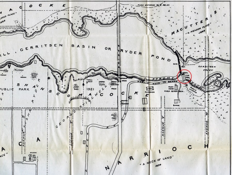 Detail of a map of Gerritsen’s mill pond from Reginald Pelham Bolton’s 1922 “Indian Paths in the Great Metropolis.” The mill is circled in red. Note the bridge carrying Avenue U over the pond.