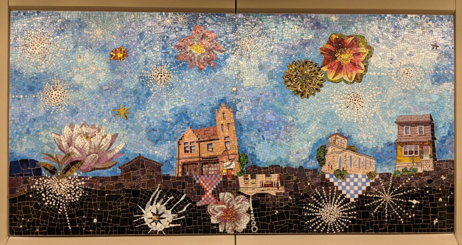 Sally Gil, “Edges of a South Brooklyn Sky,” 2018. Sea Beach line, Avenue U station, Manhattan-bound platform. Fire Engine Company 253 (center), New Utrecht Reformed Dutch Church (second from right).