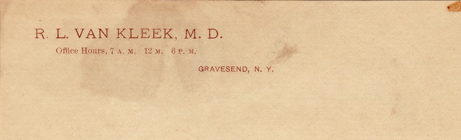 Dr. R. L. VAN KLEEK, the present medical officer to the Gravesend board of health, has held that position ever since that body was organized in 1880. Dr. Van Kleek was born at Berne, Albany County, N.Y., on March 21, 1839, but when he was four years old his father and mother removed to Flatbush. There he became a pupil in the famous Erasmus Hall Academy. In September, 1855, he entered the New York University and was graduated in June, 1858; he was made Master of Arts in 1861. He began his medical studies at the New York University in 1859, and was graduated in 1862. The following twelve months he spent on the staff of the Kings County Hospital. Dr. Van Kleek left the hospital in August, 1863, and settled at Gravesend, where he began private practice as a physician and surgeon. From 1869 until 1889 Dr. Van Kleek was postmaster of Gravesend, and from 1889 until the present time has been physician to the Health Home at Coney Island.